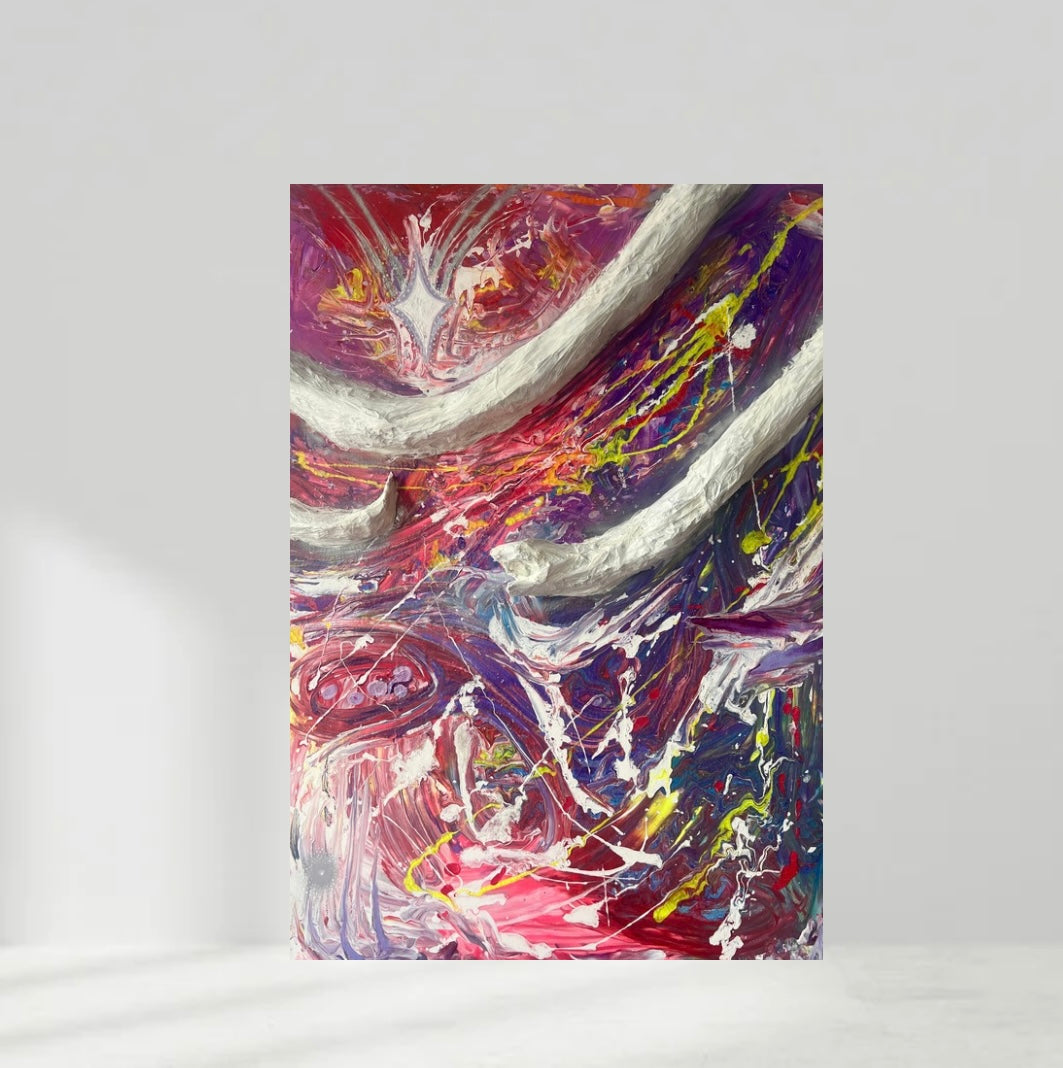 This piece is bold, galactic, and very textural with the addition of a three-dimensional white serpent - an experimental, high-energy abstract that speaks of explosions, portals, and cosmic chaos. It definitely pushes into the mixed media realm, which increases its uniqueness and marketability.