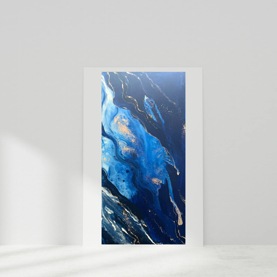 The rich indigo and cobalt layers evoke the quiet power of underwater rivers and the sacred silence of space, while golden accents pulse like veins of divine light.